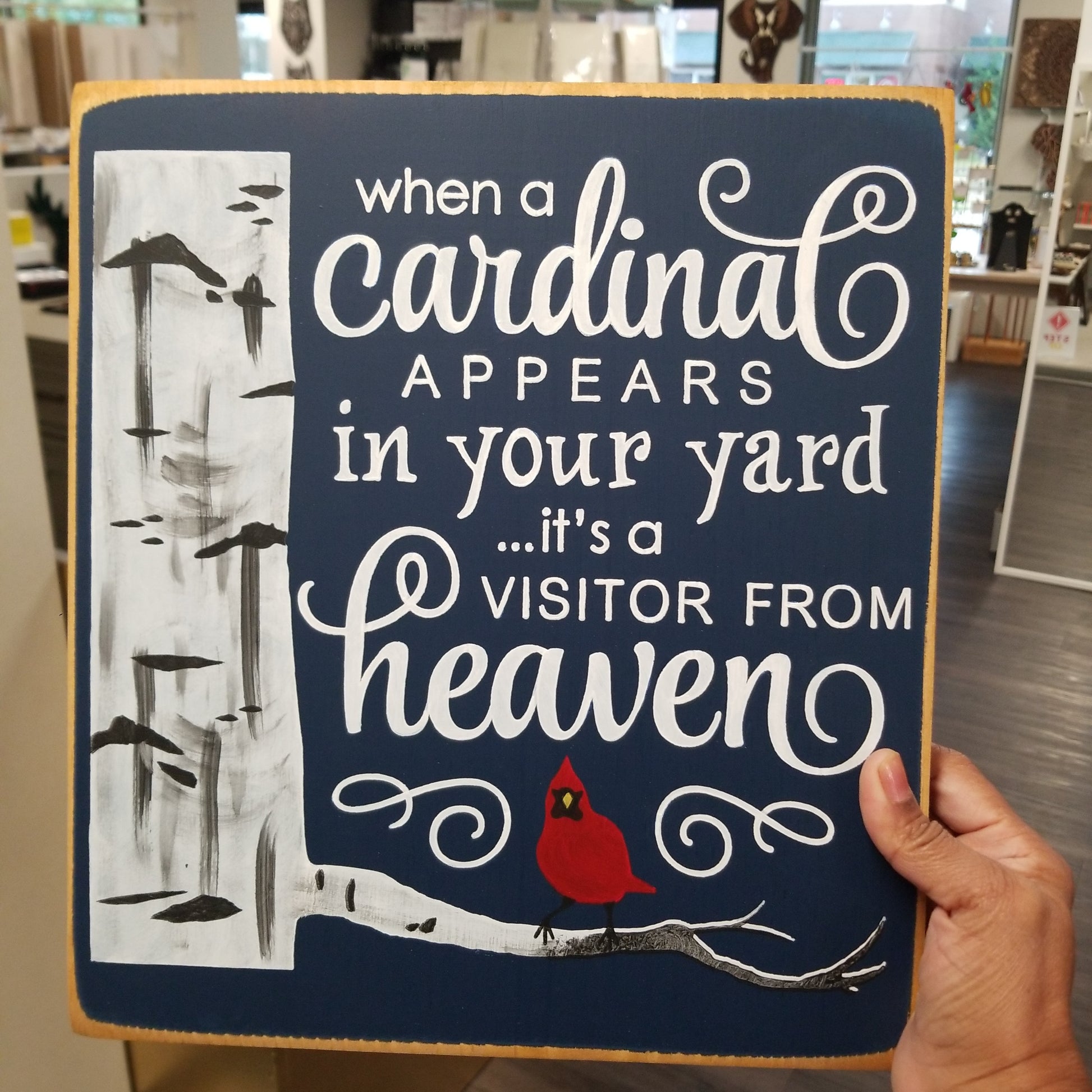 When a cardinal appears in your yard its a visitor from heaven wooden sign.