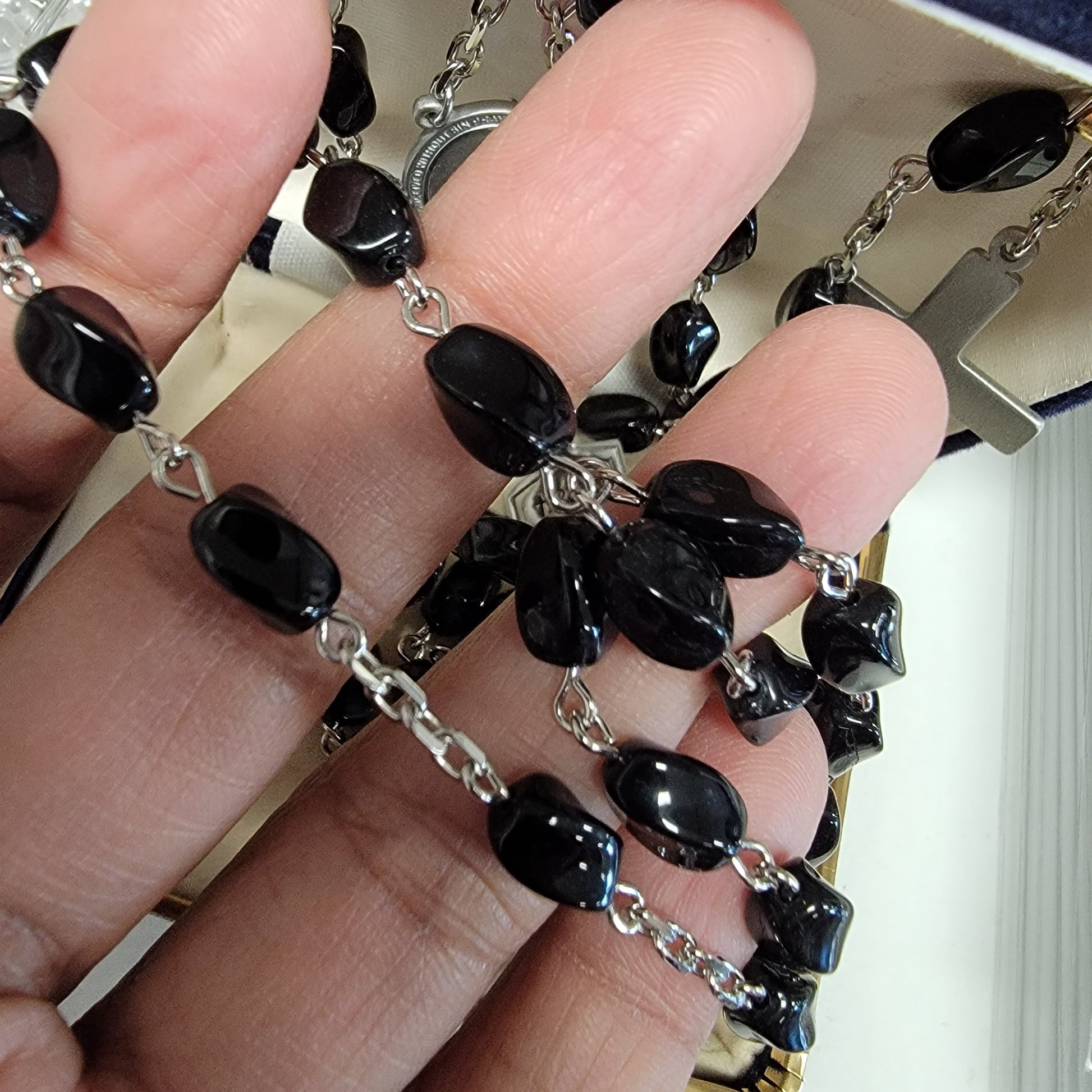 Beautiful handmade black onyx beads featuring a Miraculous Mary in the center.